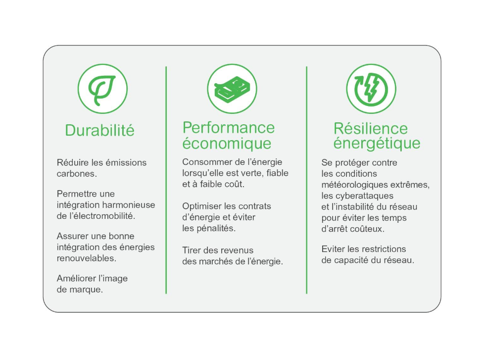 L’énergie devient un enjeu central de la stratégie d’entreprise. Les variations des coûts de l’électricité ou encore l’augmentation de la demande sur le réseau électrique national, peuvent limiter la capacité de votre organisation à atteindre ses objectifs (commerciaux, environnementaux…) et à assurer sa pérennité. Un microgrid peut jouer un rôle important pour surmonter ces défis en renforçant votre autonomie et en introduisant des sources d’énergie renouvelable générant des économies de coûts durables.